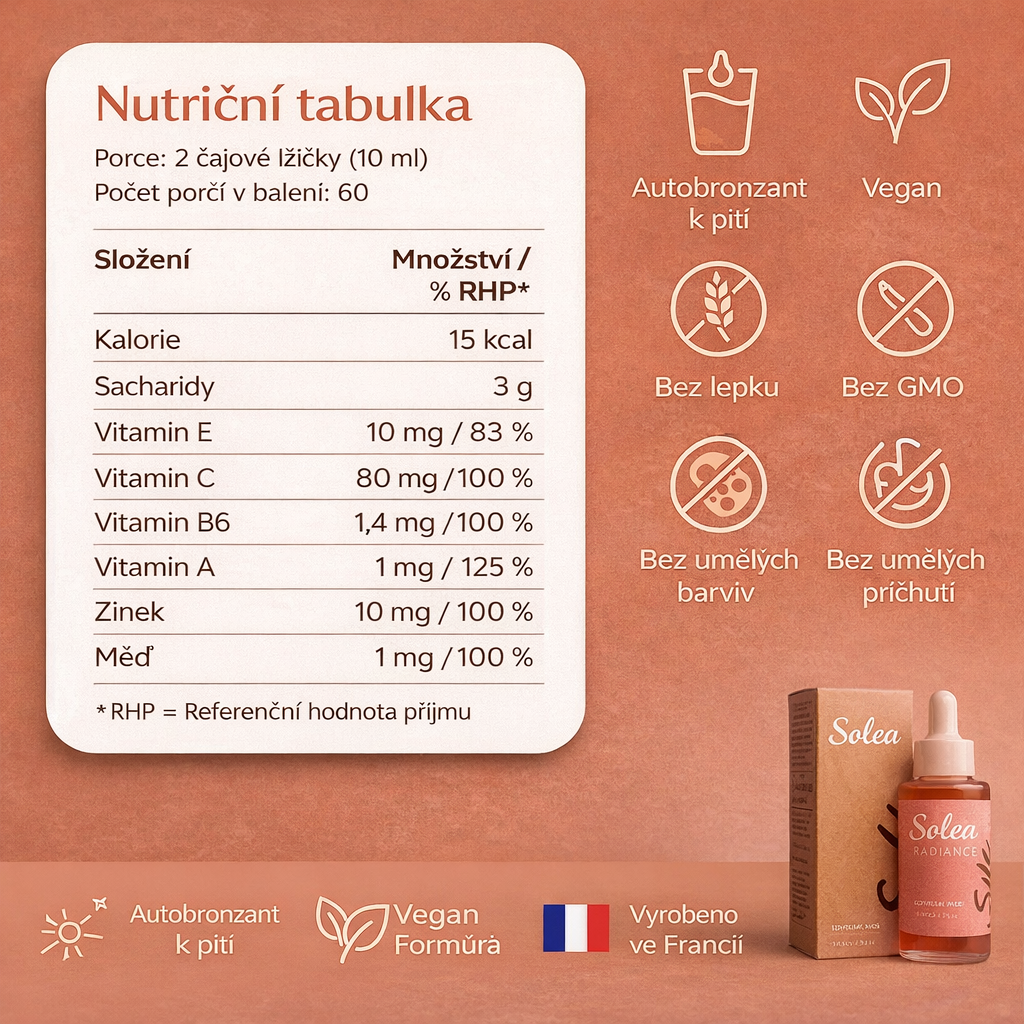 Ano, právě u vás to bude nejúčinnější. Soléa je navržena pro pleť, která se špatně opaluje nebo má sklon k červenání. Díky dodání prekurzorů melaninu (tyrosin, měď, betakaroten) pomáhá kúra vaší pleti vytvořit přirozeně zlatavé opálení, aniž byste se museli nebezpečně vystavovat slunci.